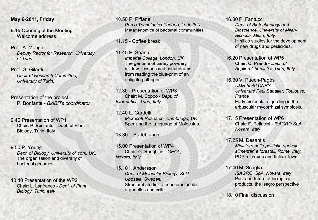 Il giorno 6 di maggio si terrà nell'Aula Magna del Dipartimento di Biologia vegetale il convegno: BIOBITS - Developing white and green biotechnologies by converging platforms from biology and information technology towards metagenomycs L'incontro, organizzato nell'ambito del progetto Regionale CIPE 2007, è curato da Paola Bonfante (paola.bonfante[at]unito.it) |
